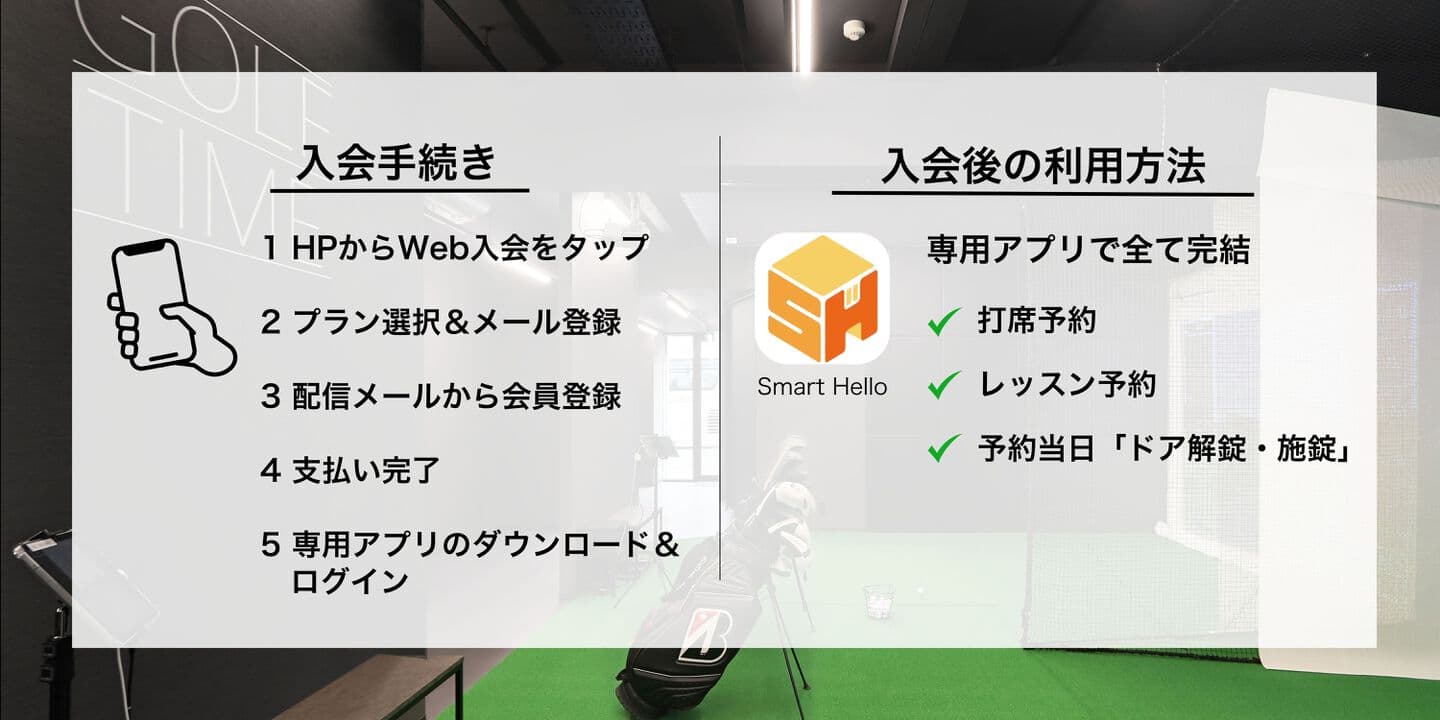 スマホから5分で入会、即利用可能! GOLF TIMEは24時間利用可能なセルフ運営、入会・打席予約・当日のドア解錠などの全てをスマホで対応します
